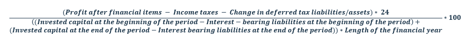 Return on equity % describes the company’s ability to manage the capital invested in the company by its owners. The target level for this indicator is determined by the owners’ return requirements. The company must be able to generate returns not only on borrowed capital but also on its own equity